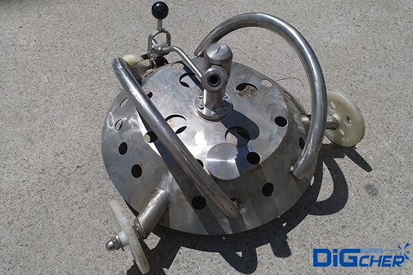 空化射流拋光器由兩個旋轉(zhuǎn)噴嘴帶動打磨盤,在清洗的同時,對螺旋槳進行拋光打磨,使其表面光滑潔凈,光滑的表面減少了海生物的附著。旋轉(zhuǎn)噴嘴外由整流罩包圍,空化現(xiàn)象能使打磨拋光盤與被清理面產(chǎn)生負壓提供吸力,設備可緊貼表面進行工作。
