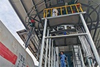 2、三維洗罐器進(jìn)給機(jī)構(gòu)是實(shí)現(xiàn)高壓清洗機(jī)與罐車口的精準(zhǔn)對(duì)位,由對(duì)位機(jī)構(gòu)和內(nèi)架、外架等組成,配有電機(jī)功率4 Kw的油站。三維洗罐器進(jìn)給機(jī)構(gòu)布置在罐車軌道安全線外,與鐵路線平行;外支架上安裝有液壓絞車,液壓絞車通過鋼絲帶動(dòng)對(duì)位機(jī)構(gòu)上升和下降,對(duì)位機(jī)構(gòu)的前端有滑塊與高壓清洗機(jī)連接滑塊可以前后移動(dòng),其運(yùn)動(dòng)方向始終與罐車軸線垂直。起升高度2.35m,提升速度可達(dá)2 m/min。